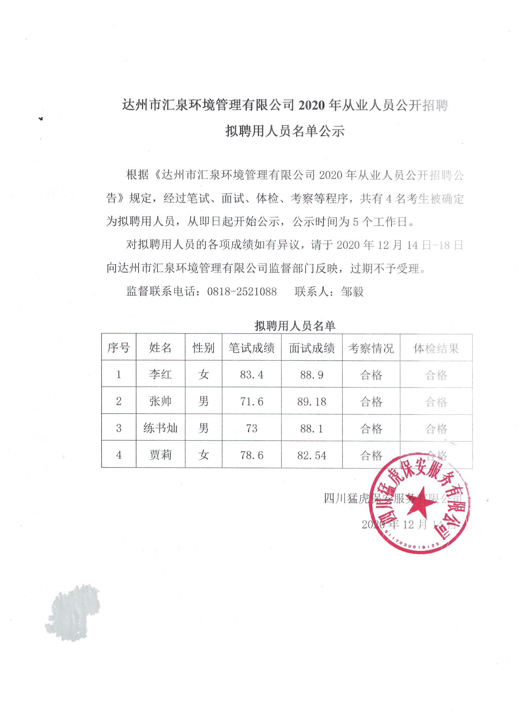 標(biāo)題:達(dá)州市匯泉管理有限公司2020從業(yè)人員公開招聘擬聘用人員名單